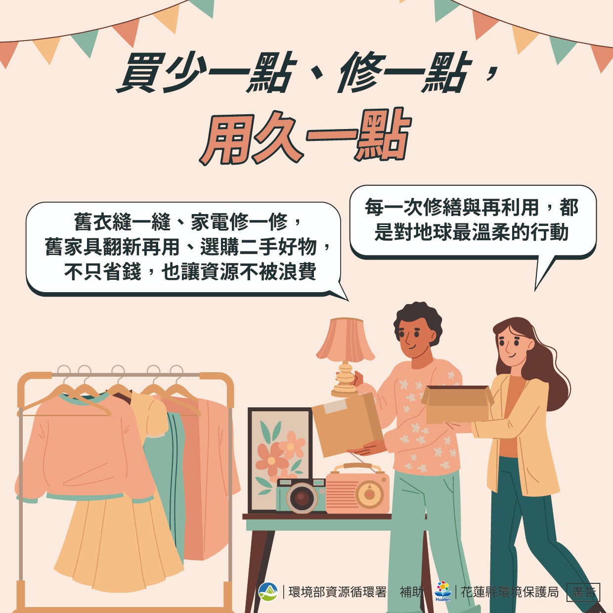 徐縣長進一步強調,為響應聯合國永續發展目標(SDGs)之SDG11「永續城鄉」與SDG12「責任消費與生產」指標,呼籲民眾持續落實「垃圾分三類」(一般垃圾、資源回收、廚餘),並於日常生活中實踐源頭減量行動,例如自備環保杯、餐具及購物袋,減少使用一次性產品,以修繕取代購買新品,延長物品使用壽命,讓環保融入生活日常,共同打造「永續花蓮」之美好願景。