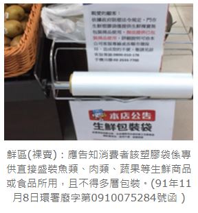 8.為何須要付費取得的原因明定限制使用對象不得免費提供購物用塑膠袋且其售價不得內含於消費者所購買之商品中,即促使「購物用塑膠袋」由附贈盛裝物變成商品,銷售人員必須詢問消費者意願。 消費者於購買商品結帳時,被徵詢是否購買「購物用塑膠袋」,可以多一次思考,並以徒手拿(不使用)、納入隨身之其他袋子、自備環保袋等方式,而達減少使用之政策目標。 此外,透過付費取得之設計,達以價制量的效果。