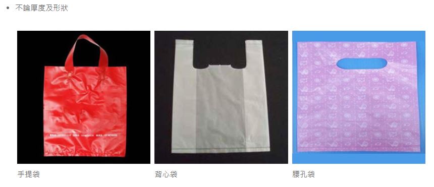 4.何謂購物用塑膠袋答:購物用塑膠袋係指提供消費者裝提其購買商品所需之塑膠袋。例如結帳櫃台提供消費者裝提其所購買之商品之塑膠提袋、手提袋、背心袋、腰孔袋、四兩紅白袋、卡口式杯袋或T型袋等或性質相似者,都是本公告所稱之購物用塑膠袋。